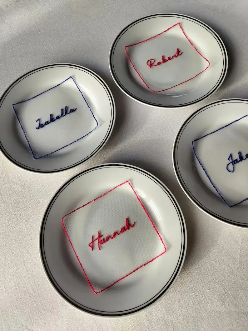 Diese Tischkarten werden handbestickt, entweder mit schwarzem, blauen oder rotem Garn. Eine ausgefallene Idee, die nach der Hochzeit auch ein tolles Andenken ist.