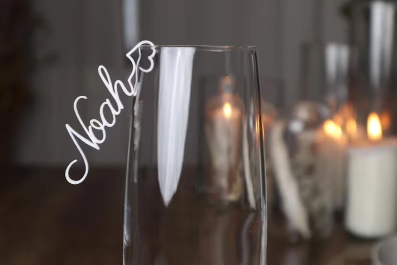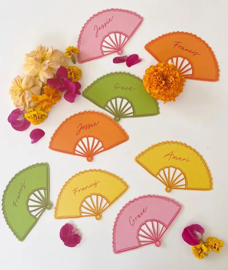 Diese bunten Tischkarten sind ein wahrer Hingucker in Fächerform. Dieser Etsy Shop hat weitere ausgefallene Tischkarten im Angebot, wie zum Beispiel Tischkarten in Schwanenform oder Blumenform. Eine weitere schöne Idee sind handbemalte Weinglashalter.