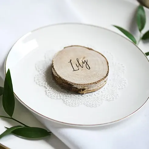 Für eine rustikale Hochzeit sind diese Holzscheiben eine tolle Tischkartenidee. Die Holzscheiben müssen allerdings selbst beschriftet werden, sind dafür aber auch vergleichsweise günstig.