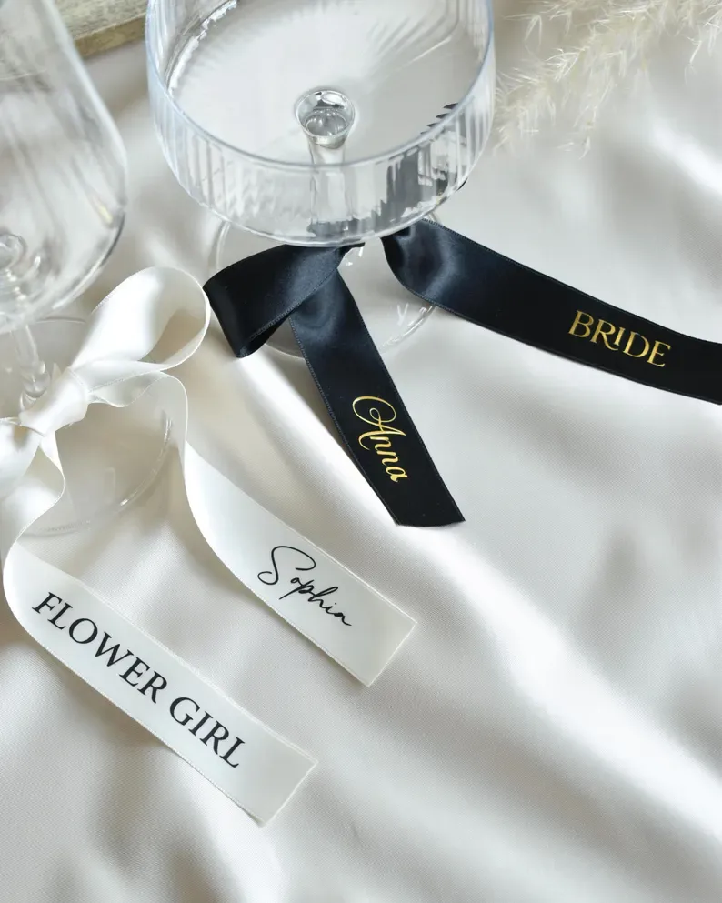 Diese Satinband kann entweder an beiden Enden oder nur an einem beschriftet werden. Eine kreative Idee, um eure Tischkarten nahtlos in eure Tischdeko zu integrieren.
