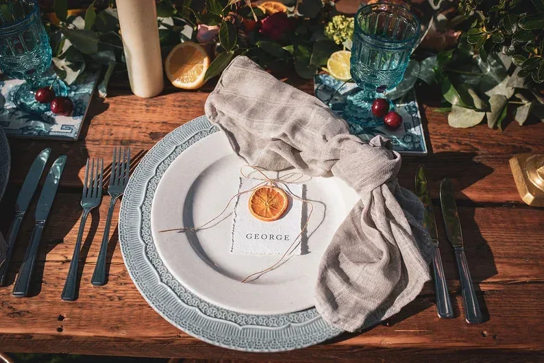 Wenn ihr zum Beispiel eine mediterrane Hochzeit feiern werdet, könnten diese Tischkarten mit getrockneter Orangenscheibe ein ausgefallenes Dekoelement sein.