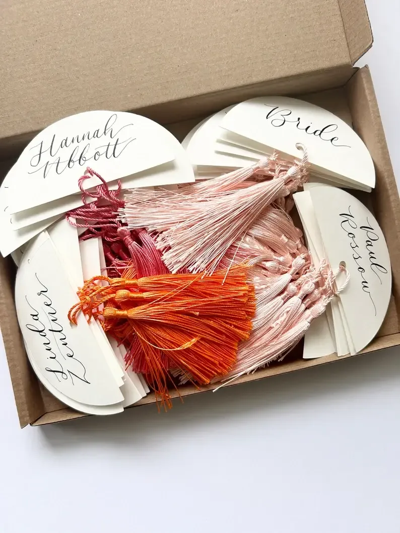Auch diese Tischkarten mit Quasten sind eine kreative Interpretation der traditionellen Platzkarten. Die Quasten gibt es in vielen verschiedenen Farben.